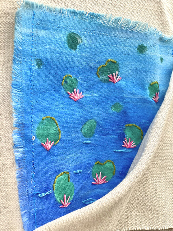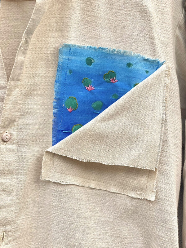 A fusion of craftsmanship: Hand-painted and hand-embroidered, this shirt brings the tranquil beauty of a lotus pond to life through mixed media art.