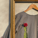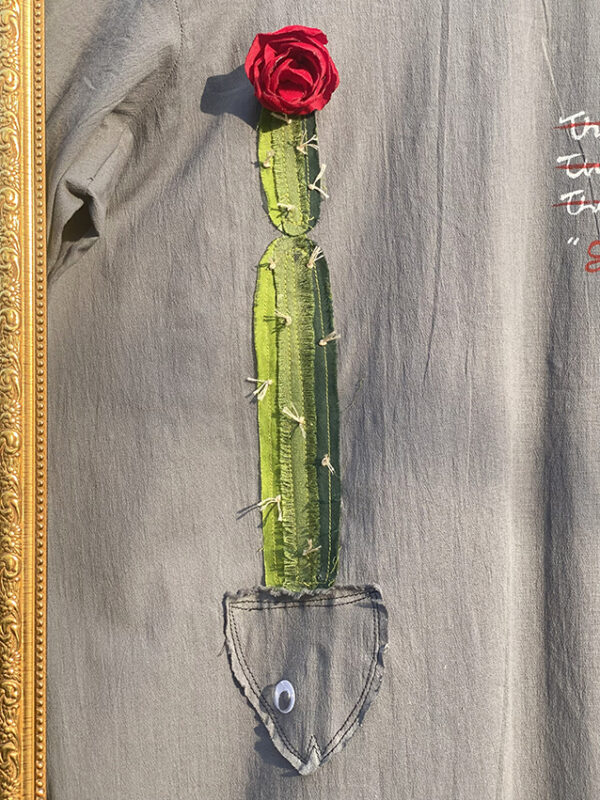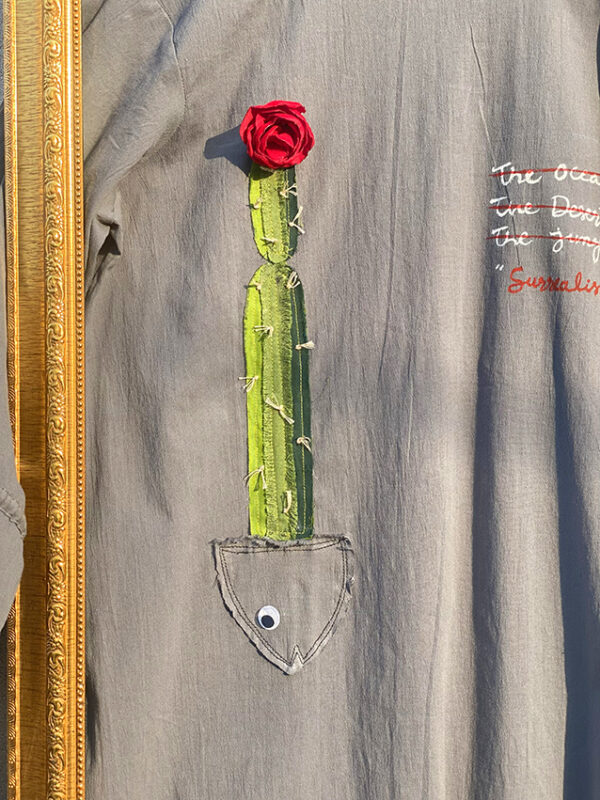 Step into a world where surrealism. This mix-media shirt showcases a patchwork cactus, complete with thorns and a delicate rose, emerging from a fish. With intricate stitch details, hand embroidery, and 3D artwork, it’s a fusion of nature’s elements reimagined in an otherworldly design—crafted to make you see beauty in the unexpected.